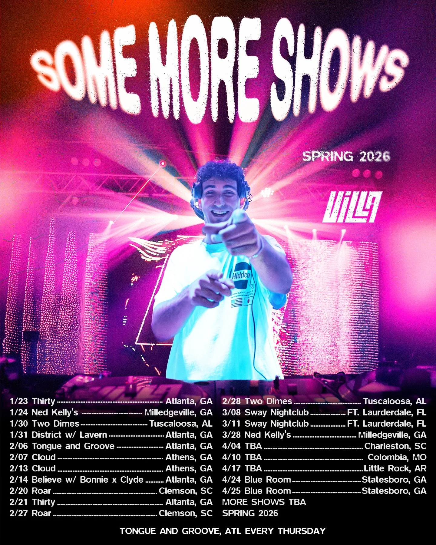 Villa has made a name as a resident at Tongue and Groove, repeatedly named Atlanta’s top nightclub. He has headlined sold-out nights at District, Believe Music Hall, and Domaine, filling these iconic venues with thousands of attendees. His reach extends beyond Atlanta with performances spanning over twenty cities and across the East Coast, making stops at notable venues such as Sway (Fort Lauderdale), Trio (Charlotte), Still Life (Chapell Hill and Greenville), and Two Dimes (Tuscaloosa). Villa has been a supporting act for a wide range of artists including Dombresky, Dzeko, Ayybo, Pickle, Proppa, Dababy, B.O.B, Bonnie & Clyde, Lavern, Madeintyo, & Four Color Zack.